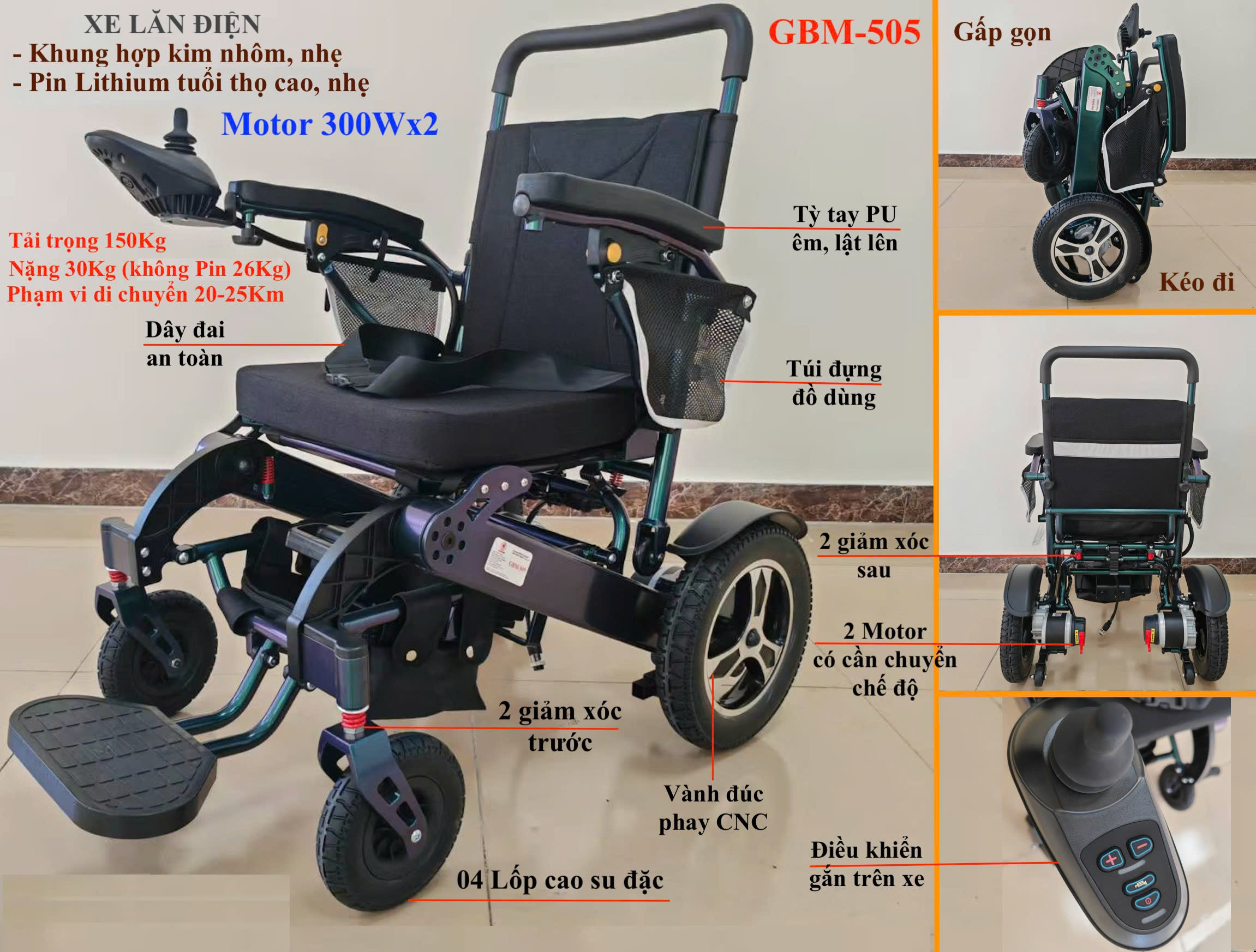 – Khi gấp gọn ta có thể kéo đi hoặc đẩy đi do xe thiết kế thêm 02 bánh phụ sẽ chạm đất khi gấp gọn kết hợp với 02 bánh sau tạo thành 04 bánh xe giúp đẩy đi nhẹ nhàng